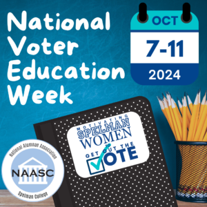 Caption:October 7-11 is National Voter Education Week! Visit https://nationalvotereducationweek.org/ to help voters bridge the gap between registering to vote and actually casting a ballot.. Count your activity by logging your activity on naasc.org #NAASCVotes #SpelmanVotes #SWV2024 |