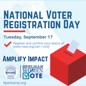 Caption:Today is National Voter Registration Day. Register and confirm your status at nass.org/can-I-vote Make sure your activity counts by logging your activity at https://forms.gle/525A9uFyLYYVCVUv7 #NAASCVotes #SpelmanWomenVote #SWV2024 |