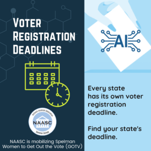 Caption:Every state has its own voter registration deadline. Visit www.nass.org/can-I-vote to register and to find your state’s registration deadline. Count your activity by logging your activity on naasc.org #NAASCVotes #SpelmanVotes #SWV2024 |